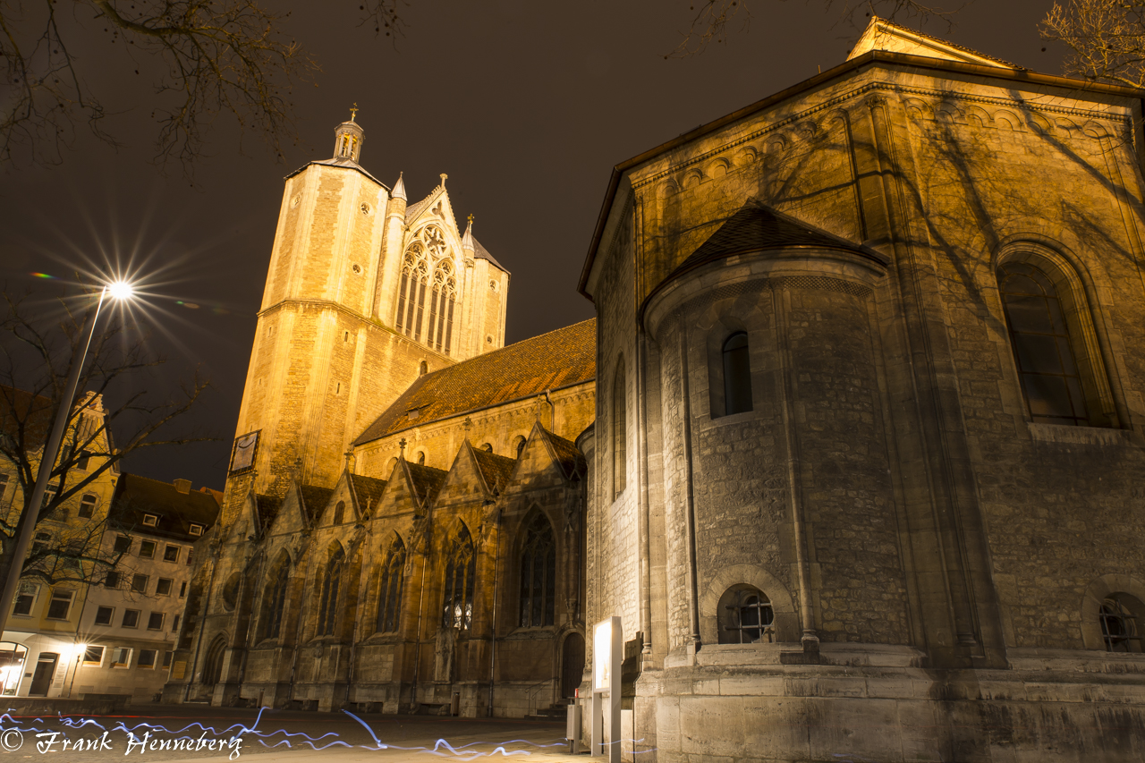 Der Braunschweiger Dom am Abend mit Langzeitbelichtung und Lichtspuren.
