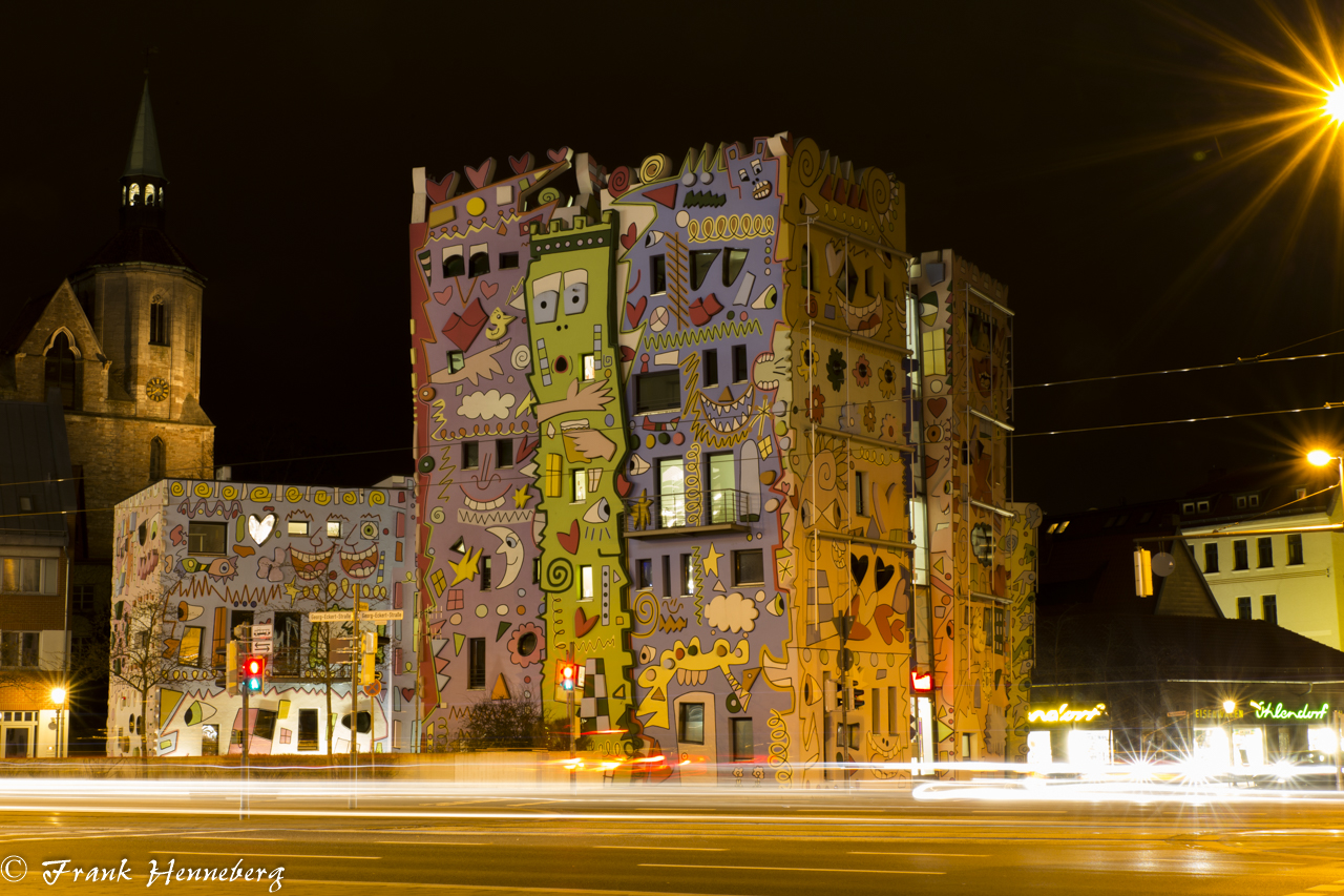 Das Happy Rizzi House in Braunschweig mit Kirche im Hintergrund und Lichtstreifen im Vordergrund, die durch den Verkehr und der Langzeitbelichtung entstanden sind.