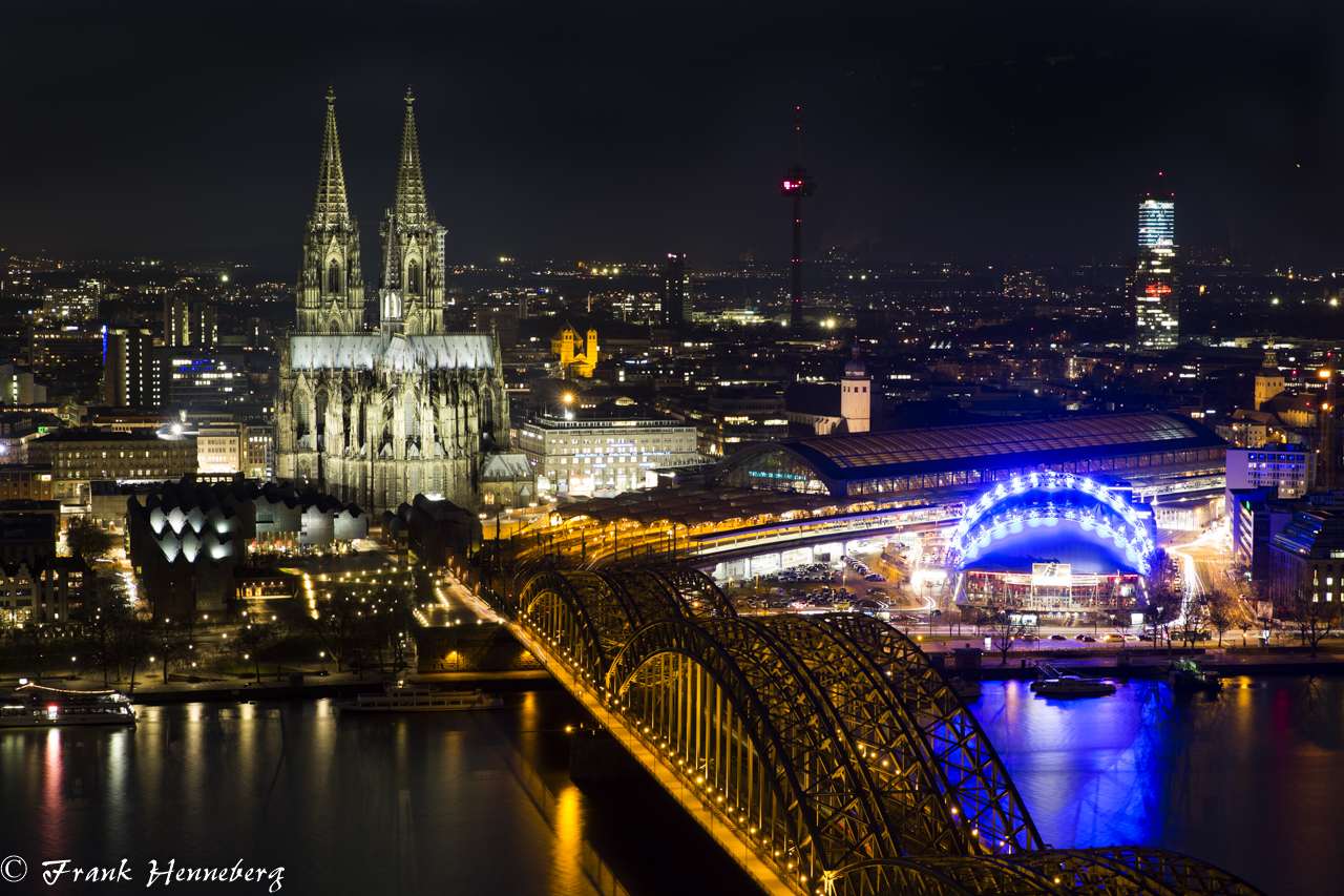 Ebenfalls von der Plattform des Triangle ist diese Fotografie entstanden . Auch hier ist der Kölner Dom, die Hohenzollernbrücke und das Musical Köln in den Vordergrund gesetzt.