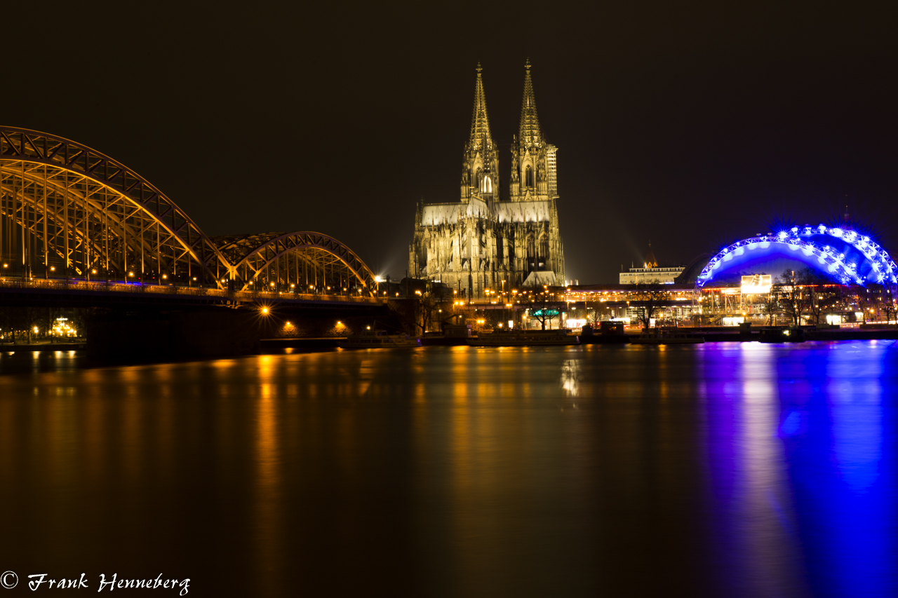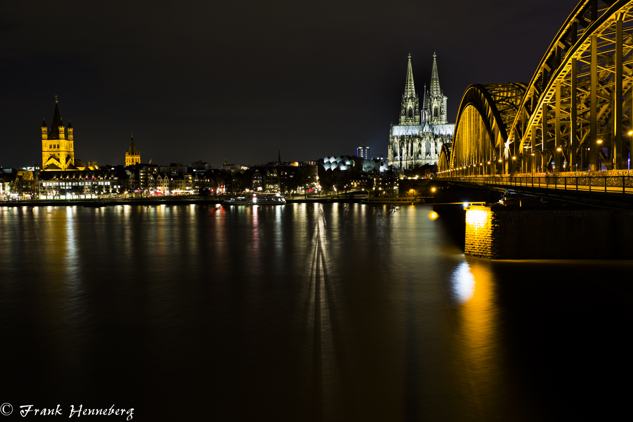Hohenzollernbrücke, der Dom und der Rhein als Motiv in der Langzeitbelichtung. Fotografiert wurde dieses Foto vom Nennedy Ufer aus.