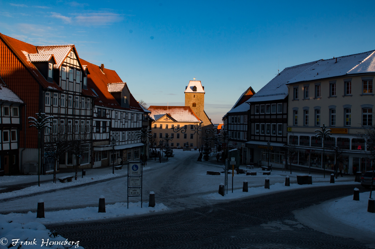 Die Schöninger Innenstadt am Nachmittag bei tiefstehender Sonne im Winter.