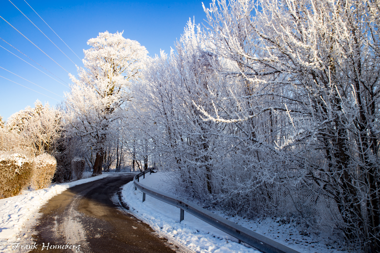 Wintereindrücke bei klarem und sehr sonnigem Wetter. Gefrorener Schnee in Bäumen und entlang der Straßen.