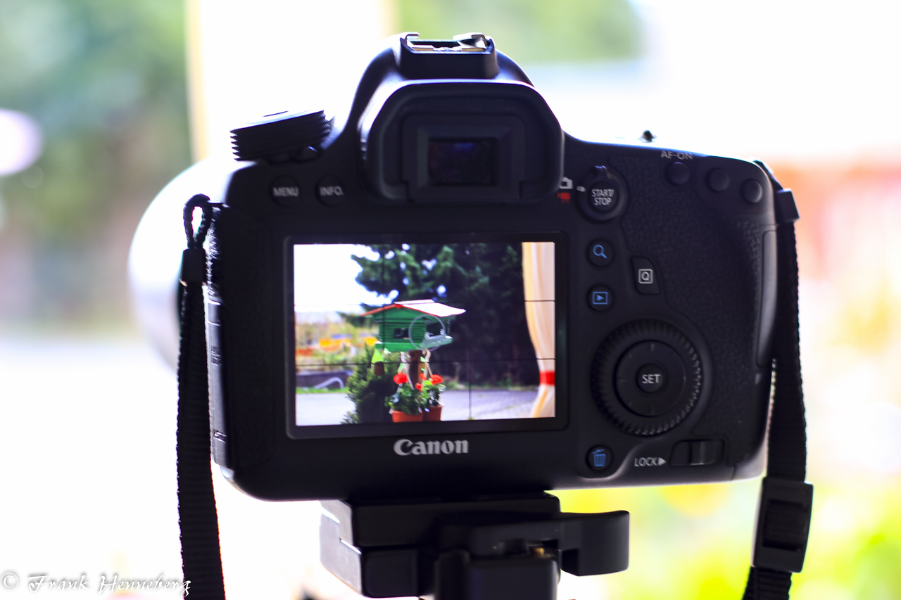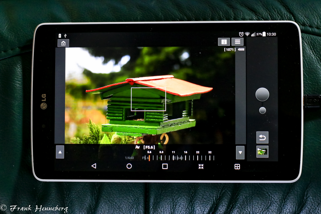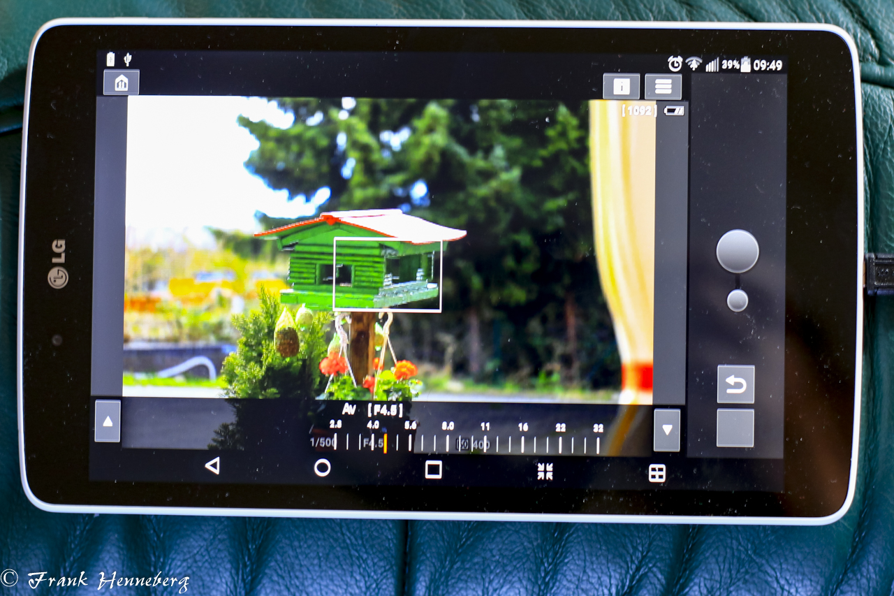 Dazu gibt es eine einfache Lösung, wenn man in Besitz einer Kamera mit WiFi ist. Ich habe jetzt mal einen ganzen Tag mit der Kamera spezielle Vogelaufnahmen gemacht. Als erstes habe ich mir auf mein Tablet mit Android die App "Camera Connect" geladen, welche für Canon Kameras zur Verfügung steht. Dann habe ich die Kamera per WLan mit dem Tablet verbunden und die App gestartet. Nun konnte ich das Geschehen vor der Kamera, welche auf einem Stativ befestigt war auf dem Tablet verfolgen. Die Kamera war auf mein Vogelhäuschen im Vorgarten ausgerichtet und der Autofokus auf Manuell dorthin eingestellt. Auch den Imagestabilisator habe ich deaktiviert. Alle anderen Einstellungen der Kamera kann man über die App einstellen und den Auslöser fernsteuern.