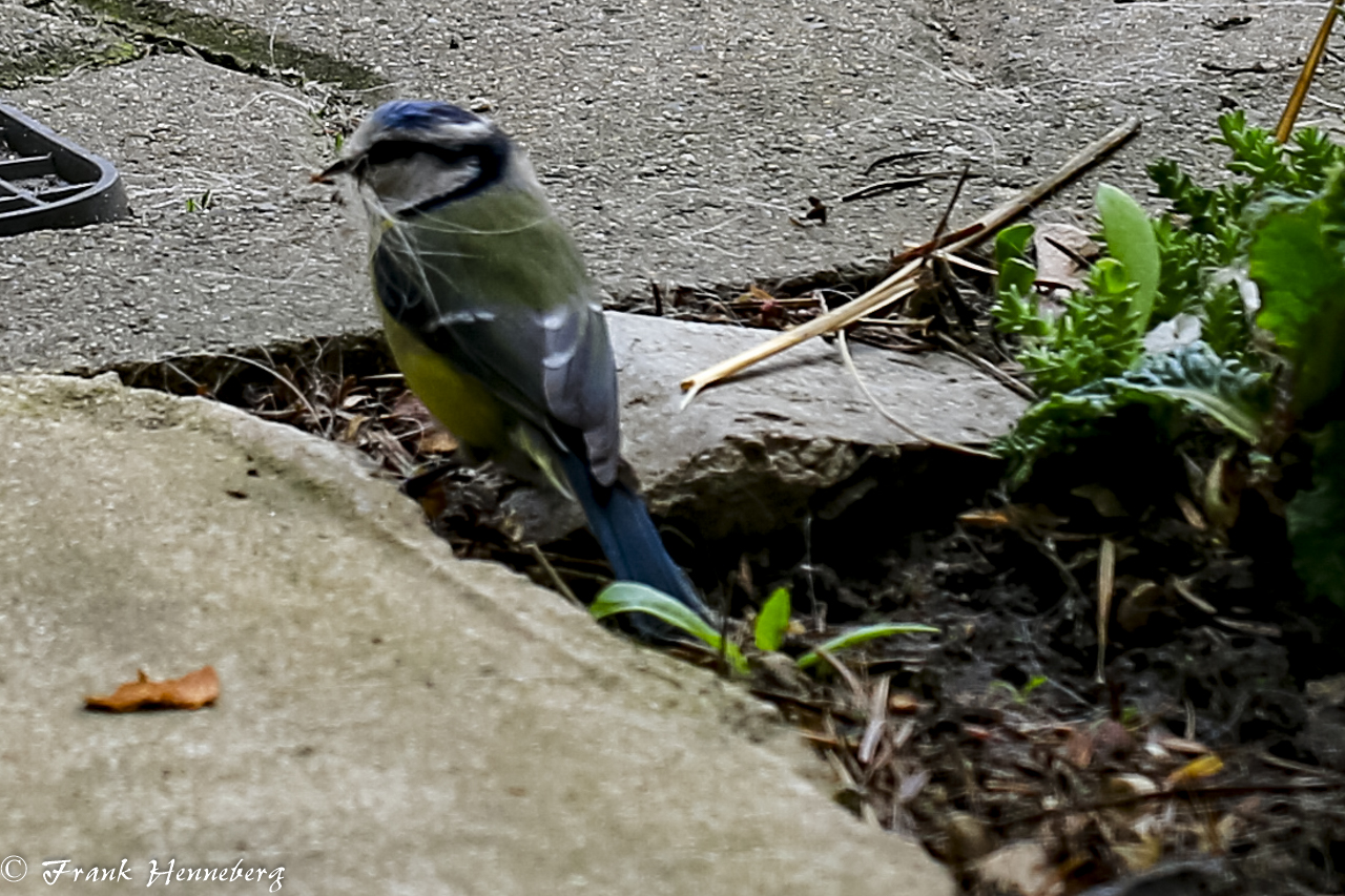 Hier hat die Meise schon einiges an Nestmaterialien zusammen gesammelt. Fotografiert habe ich dieses und das vorherige Foto aus der Hand aber dieses Mal mit Autofokus und Bildstabilisator.